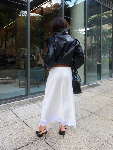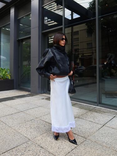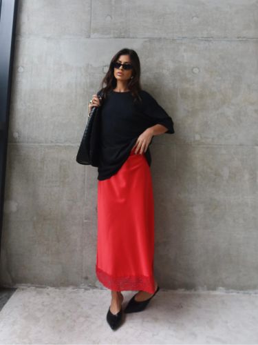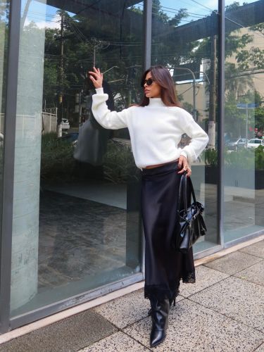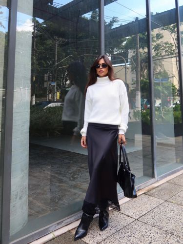 Saia em cetim com caimento impecável e toque acetinado que traz leve brilho e sofisticação ao look. O modelo possui comprimento midi e modelagem fluida, valorizando a silhueta com elegância e movimento. O destaque fica por conta do acabamento em renda delicada na barra, que adiciona um charme feminino e refinado à peça. Versátil e atemporal, é perfeita para composições que transitam do casual ao sofisticado com facilidade.